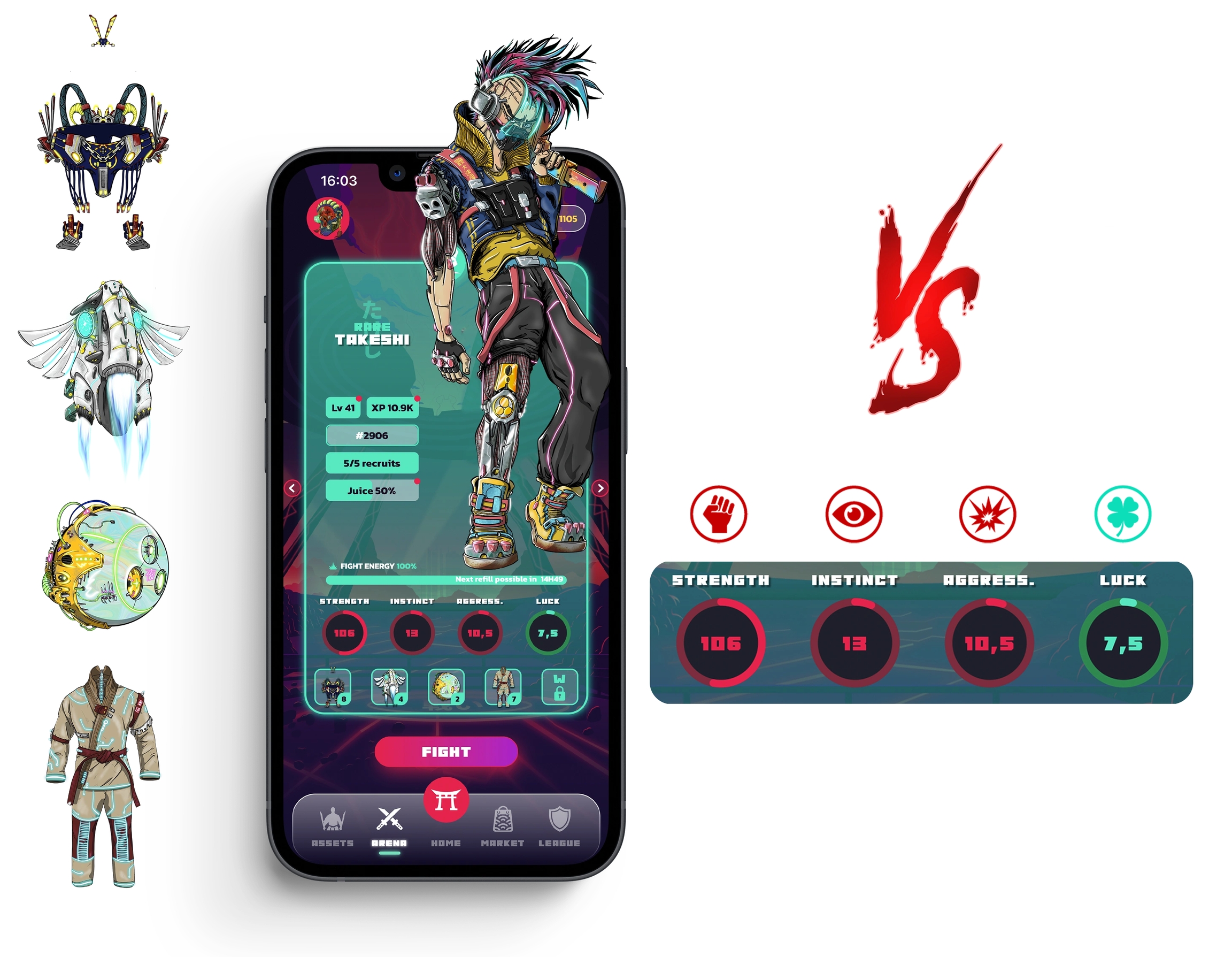 戦闘は自動で行われ、勝利の確率は二つのサイバー・ヤクザ戦略の対決によって決まります。トークンを獲得するためには、さまざまな戦略を試し、最も効率的なものを採用する必要があります!