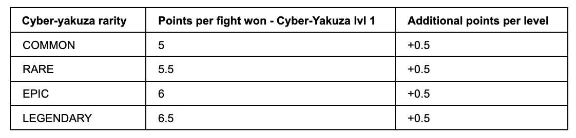 レベル10のCOMMONサイバー・ヤクザが戦いに勝つと9.5ポイントを獲得します(5の基本ポイント + レベルに対する0.5 x 9ポイント)。
