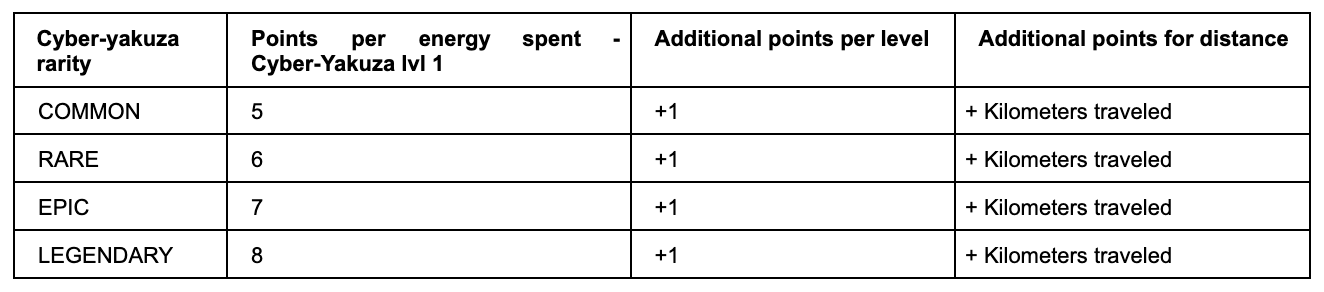 レベル10のCOMMONサイバー・ヤクザが2歩のエネルギーを消費し、0.2キロメートルを移動すると、[(5 + 9 x 1) x 2] + 0.2 = 28.2ポイントを獲得します。