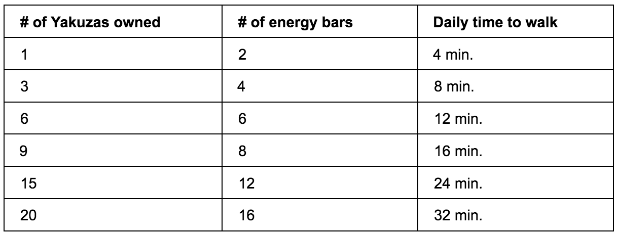 サイバー・ヤクザとして、NFTを所有することで、ストリートミッションに参加するためのエネルギーバーを利用できます。各エネルギーバーは2分間のウォーキングセッションを表し、最大容量は16バーです。